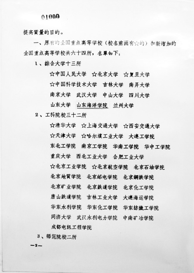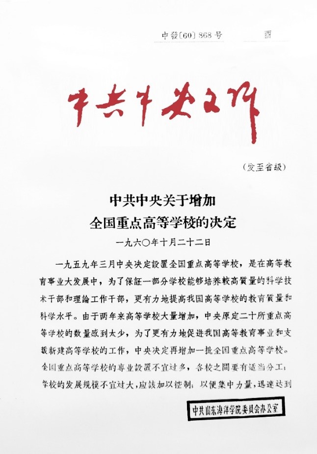 1960年10月,在《中共中央關于增加全國重點高等學校的決定》中,公布了64所全國重點高校,山東海洋學院被列為13所綜合大學之一。由此,學校步入特色發展的歷史新階段。
