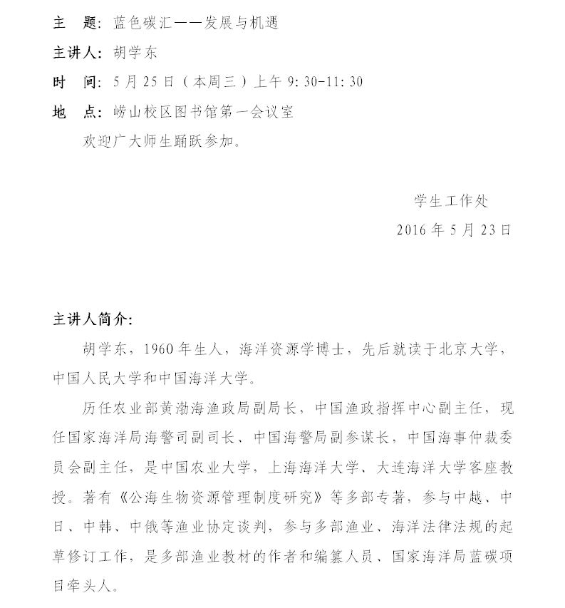 • 主題:與壓力共舞---輔導員自我成長與發展主講人:周紅教授時間:12月9日(星期二)13:30-16:00地點:嶗山校區輔樓會議廳歡迎廣大師生踴躍參加!主講人簡介:南京師范大學心理健康教育咨詢中心主任、仙林大學城心理健康教育研究中心(基地)主任,博士,教授。在心理健康領域著述頗豐,在心理健康教育各方面有著深入的研究和探索。特別是對心理咨詢理念與技術的實際應用,有著廣泛的實踐和深入的思考。曾經擔任江蘇衛視《情感援助》欄目特約指導專家,《新聞夜宴》、《成長》等欄目的點評嘉賓,《母親學堂》特約講師,在省內外高校開設講座百余場,擁有幸福家庭一個,快樂朋友一幫,講座粉絲數千人。學生工作處2014年12月8日
