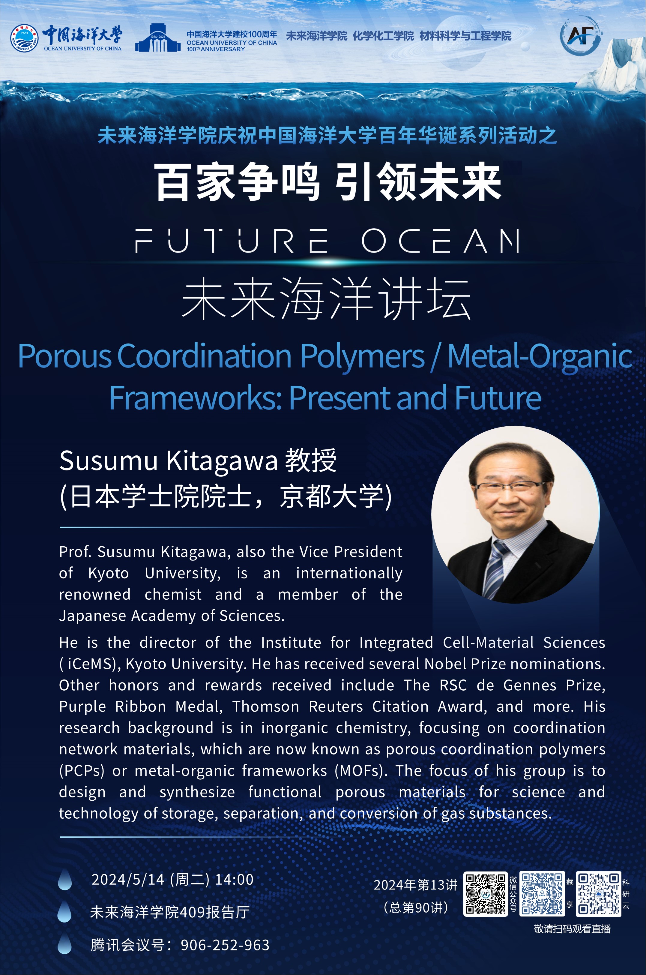 百家爭鳴 引領未來丨未來海洋講壇第90講 (2024年第13講) -Susumu Kitagawa: Porous Coordination Polymers/Metal-Organic Frameworks-Present and Future