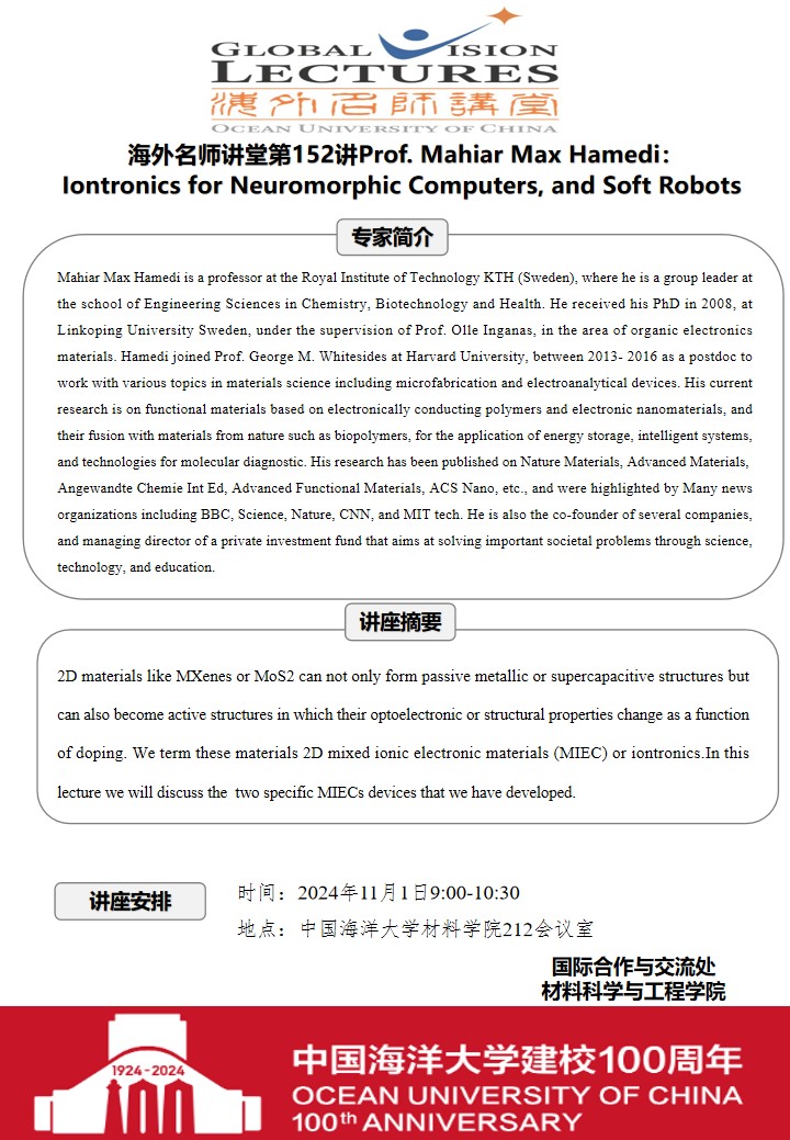 海外名師講堂第一百五十二講-Mahiar Max Hamedi:Iontronics for Neuromorphic Computers, and Soft Robots