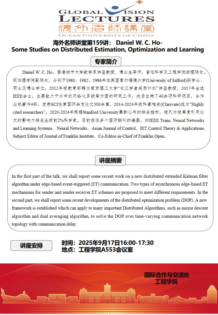 海外名師講堂第一百五十九講-Daniel W. C. Ho-Some Studies on Distributed Estimation, Optimization and Learning