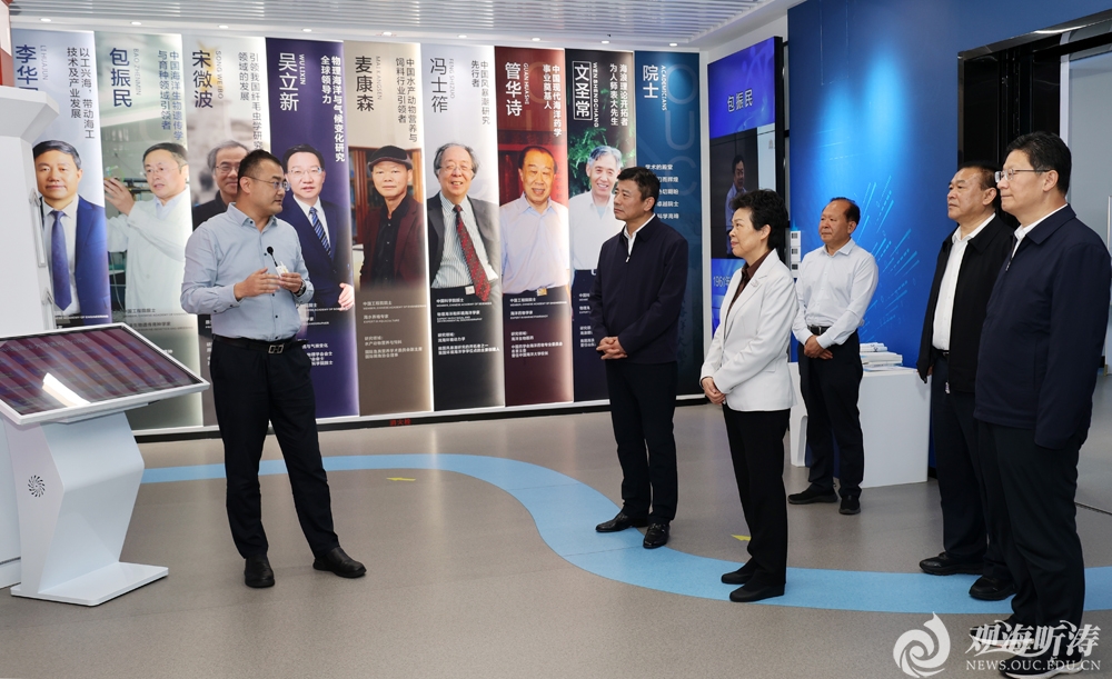 葛慧君主席(左三)考察學校海洋科技成果展廳本站訊10月14日,山東省政協主席、黨組書記葛慧君一行來校調研。學校黨委書記李明陪同調研。葛慧君一行先后到校史館、海洋科技展廳和一多樓展館考察調研,詳細了解了學校百年發展歷程和辦學成就,對學校在人才培養、科技創新等方面取得的成就給予充分肯定,希望學校進一步發揮自身優勢,加快建設特色顯著的世界一流大學,更好服務國家重大戰略,助力山東現代化強省建設,為建設教育強國、海洋強國作出更大貢獻。李明對山東省政協長期以來關心支持學校發展表示感謝,并簡要匯報了學校事業發展情況。他表示,學校將全面貫徹落實習近平總書記重要回信精神,聚焦國家重大戰略需求和山東經濟社會發展,立足青島、扎根山東、面向世界、深耕海洋,不斷深化科教融匯、產教融合、校地合作,強化科技創新、成果轉化,推進“四鏈”融合,全面提升服務國家戰略和強省建設的能力。調研中,葛慧君和學校省政協委員李廣雪、宮慶禮、汪岷親切交流。山東省政協秘書長秦傳濱,青島市政協主席孟慶斌,學校黨委副書記盧光志,學校省政協委員,山東省政協、青島市政協,學校有關單位負責人等參加調研。文:依麗娜 圖:李華昌
