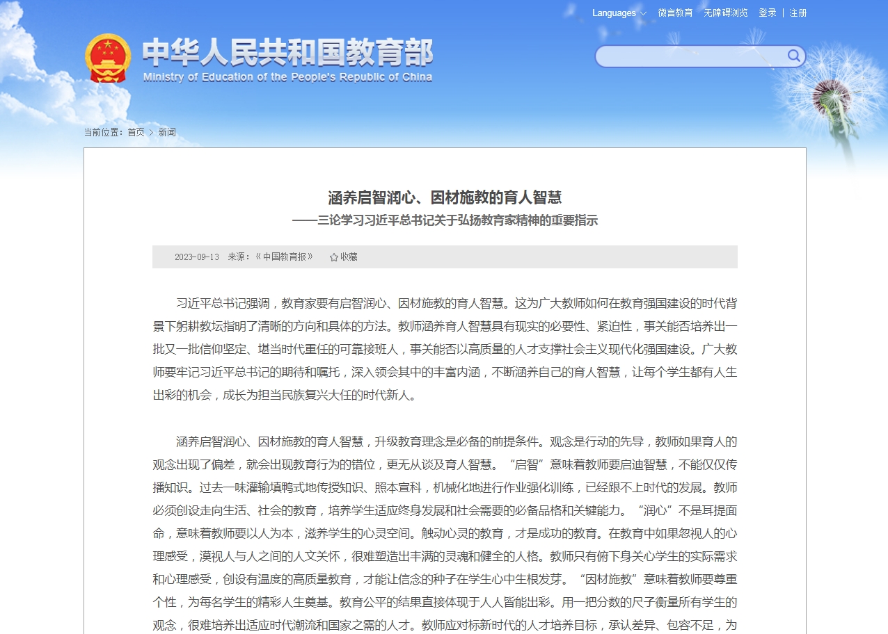 • 習近平總書記強調,教育家要有啟智潤心、因材施教的育人智慧。這為廣大教師如何在教育強國建設的時代背景下躬耕教壇指明了清晰的方向和具體的方法。教師涵養育人智慧具有現實的必要性、緊迫性,事關能否培養出一批又一批信仰堅定、堪當時代重任的可靠接班人,事關能否以高質量的人才支撐社會主義現代化強國建設。廣大教師要牢記習近平總書記的期待和囑托,深入領會其中的豐富內涵,不斷涵養自己的育人智慧,讓每個學生都有人生出彩的機會,成長為擔當民族復興大任的時代新人。