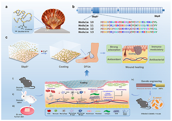 本站訊近日,中國海洋大學海洋生命學院海洋生物遺傳與育種教育部重點實驗室、方宗熙海洋生物進化與發育研究中心劉偉治團隊在基于扇貝足絲粘附蛋白的仿生材料應用于難愈合創面修復領域取得重要新進展。研究論文“Extracellular Matrix-Mimetic Intrinsic Versatile Coating Derived from Marine Adhesive Protein Promotes Diabetic Wound Healing through Regulating the Microenvironment”(海洋粘附蛋白來源的類細胞外基質涂層通過調節微環境促進糖尿病足創面愈合)發表在材料學頂級期刊ACS Nano上,海洋生命學院博士生王露露、薛波為共同第一作者,劉偉治教授為唯一通訊作者,中國海洋大學為第一完成單位和通訊作者單位。糖尿病足潰瘍(Diabetic foot ulcers, DFUs)是糖尿病嚴重并發癥之一,作為典型的難愈合創面具有極高的患病率和致殘率。創面持續滲出導致敷料降解,進而使50%的創面未得到有效護理,因此迫切需要開發兼具濕粘附性和功能性的敷料。研究