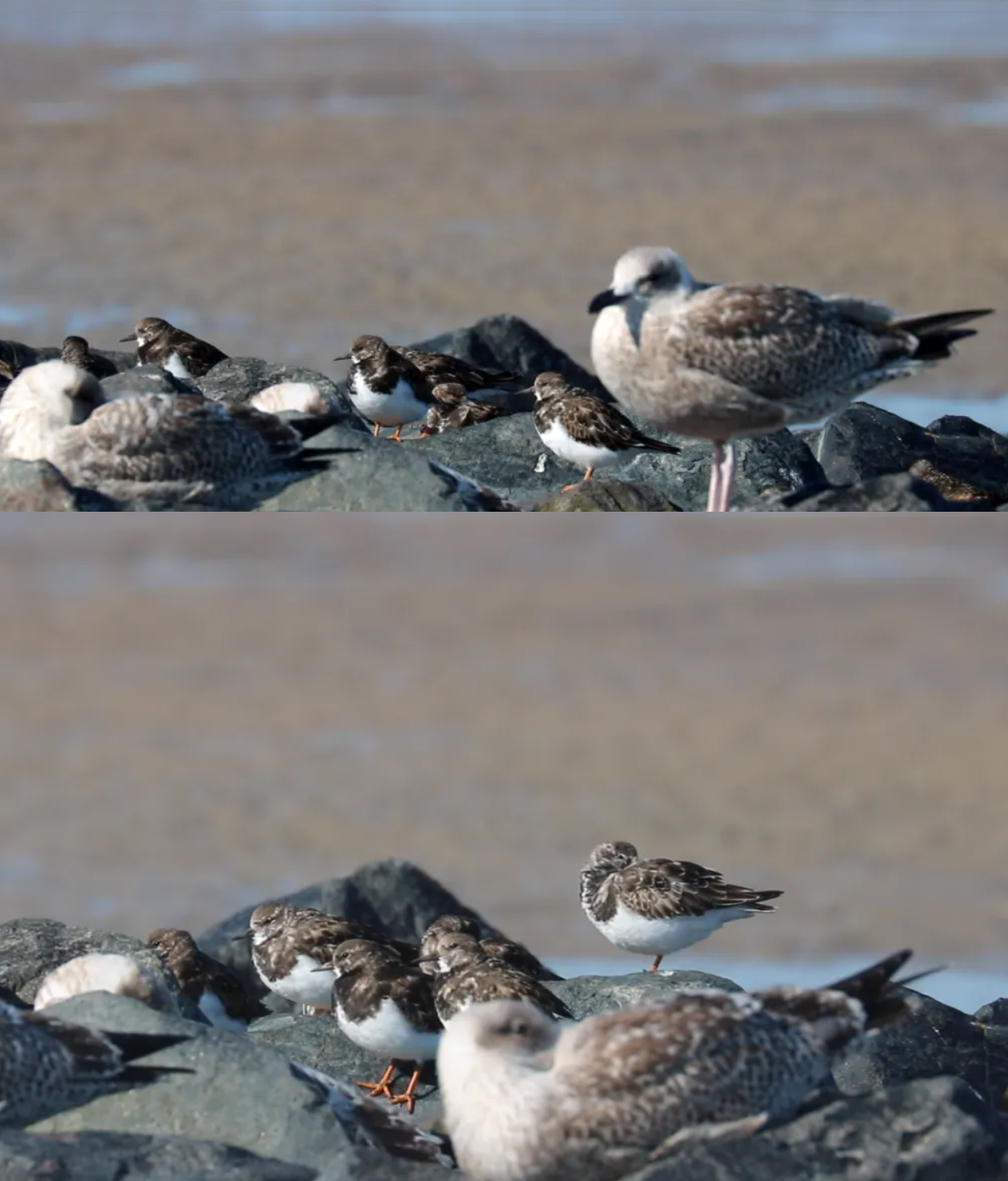 •   “翻石鷸”這個名字是不是特別有趣?它總愛用喙翻動沙灘上的石頭和貝殼,啄食小動物。翻石頭的樣子仿佛在尋找寶藏。它的英文名是“ruddy turnstone”,可以理解成“紅褐色的翻石高手”——科學家起的名字真是既生動又形象!